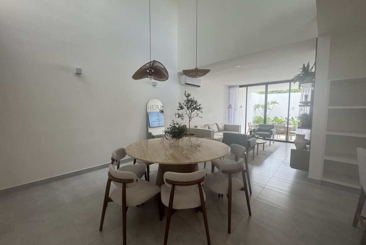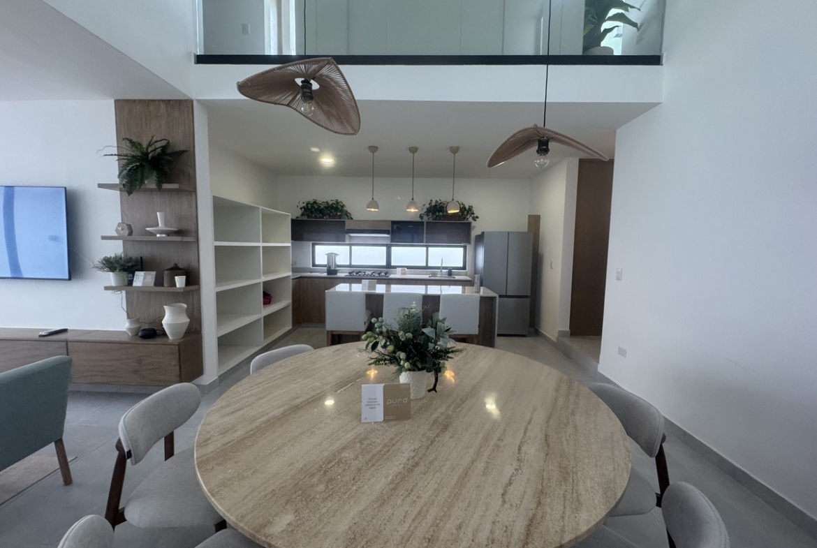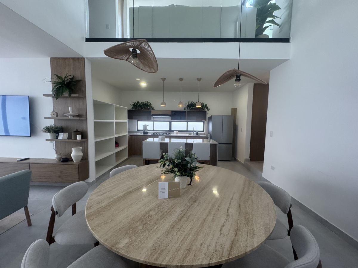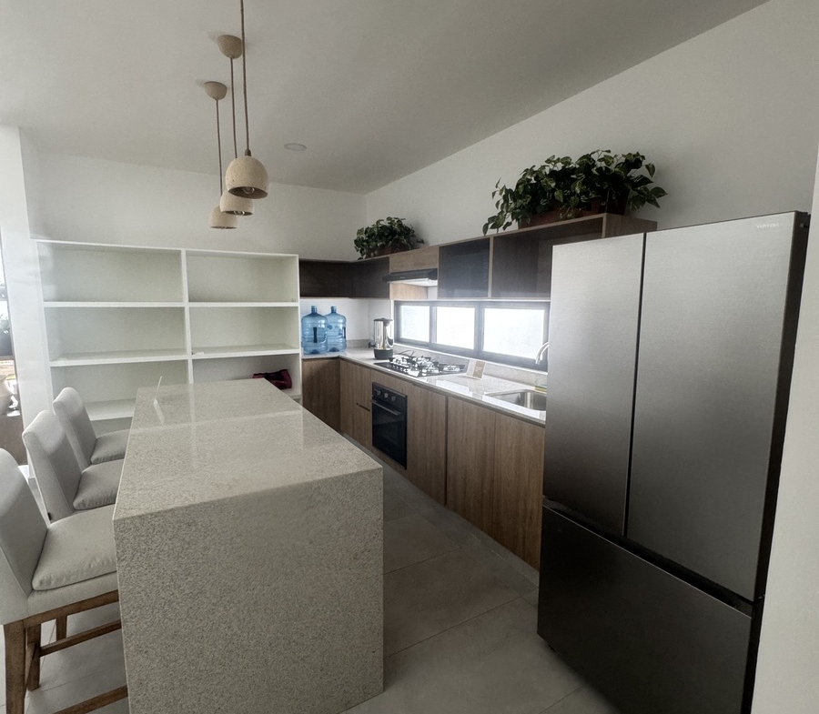 – Comedor y cocina a doble altura con isla y carpintería inferior y superior