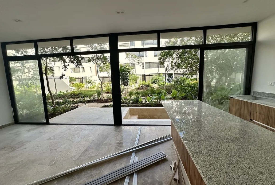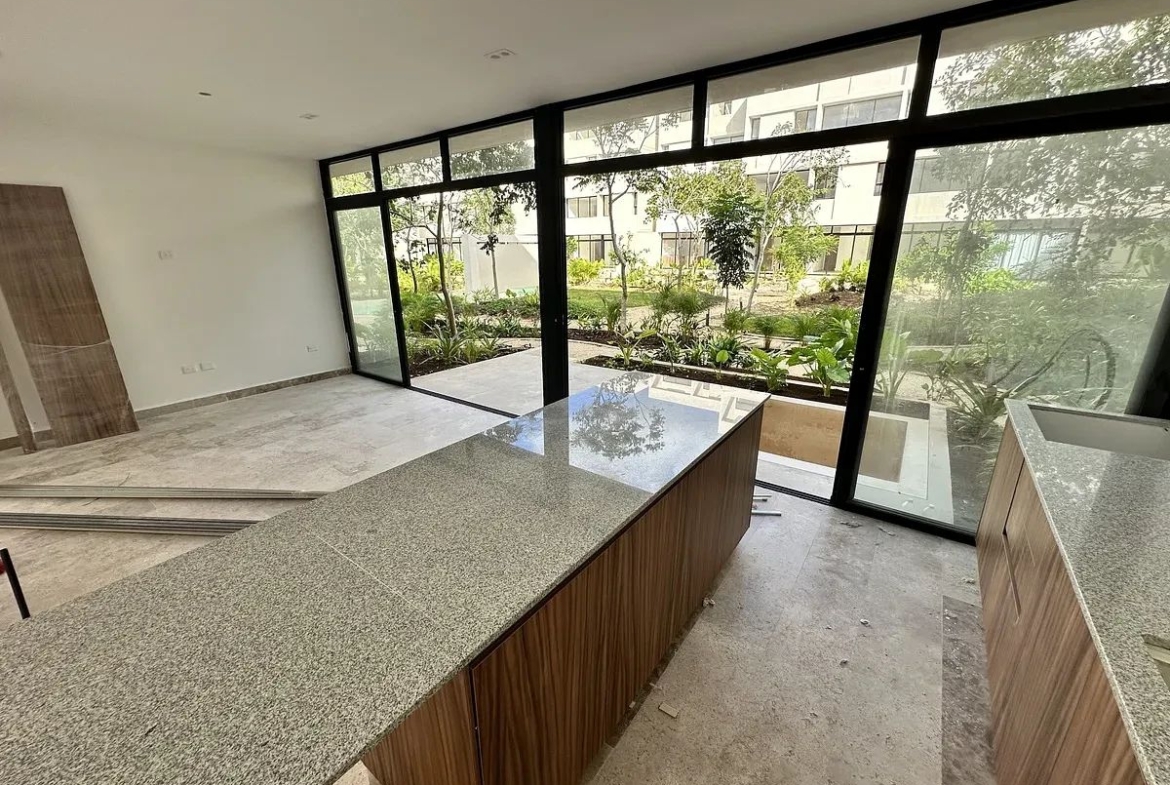 El departamento se encuentra en planta baja y forma parte de un desarrollo, rodeado de áreas verdes y con vistas al parque central del complejo.