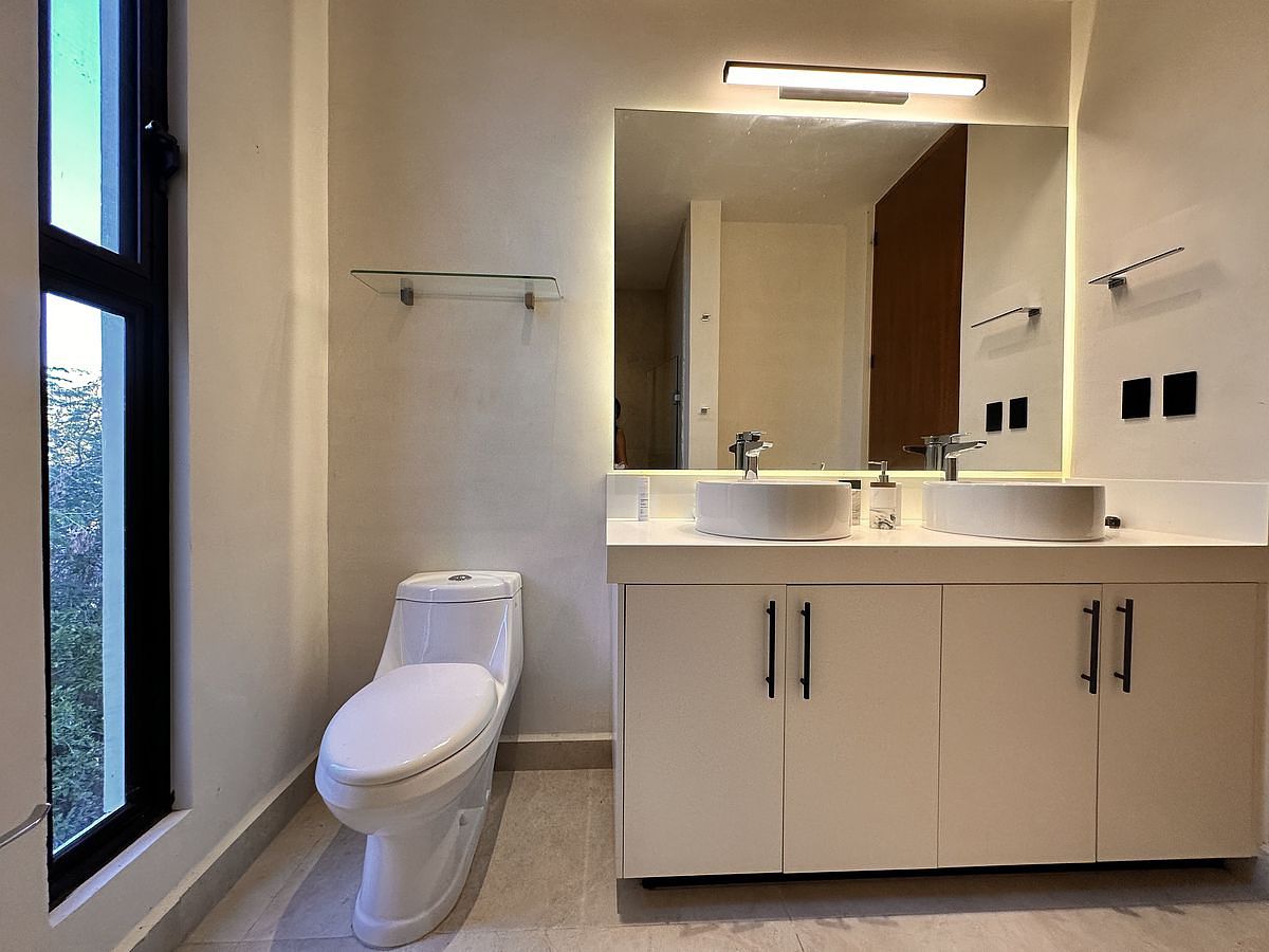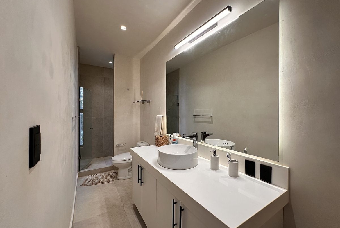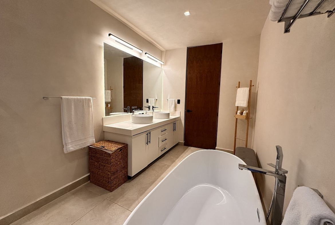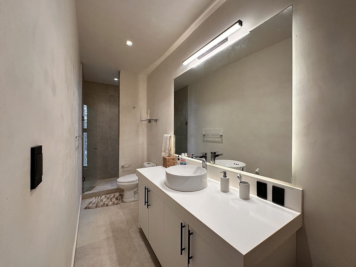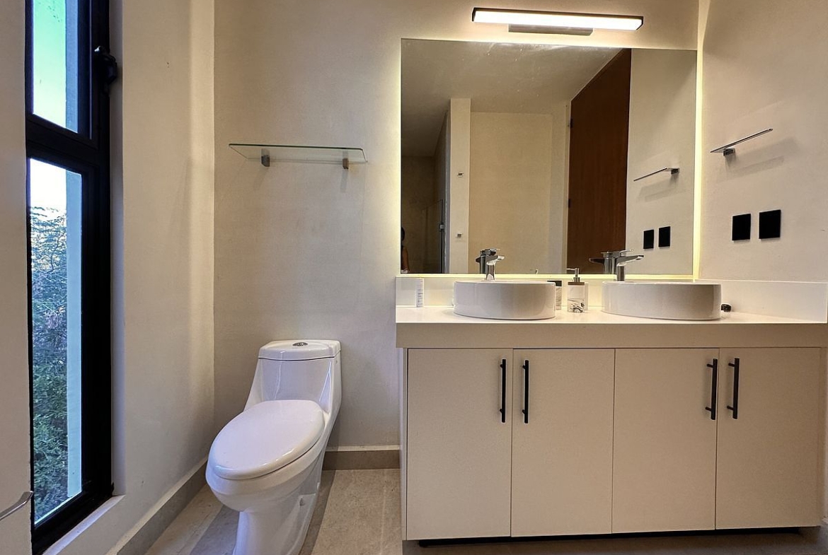 – Baños equipados con mesetas de cuarzo, cancelería, lavabos marca Kohler y grifería Helvex