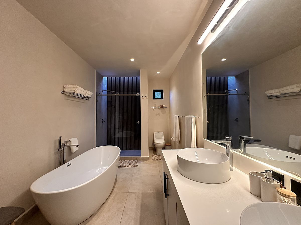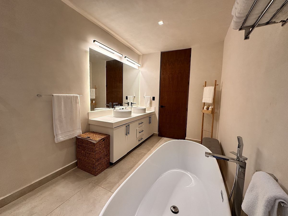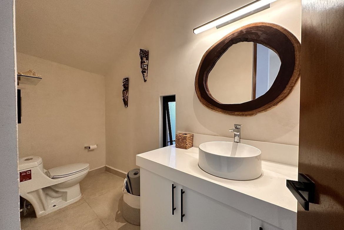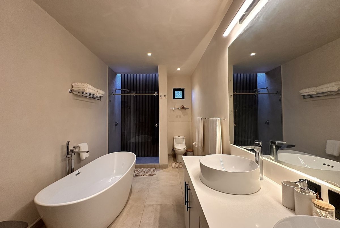 – Baños equipados con mesetas de cuarzo, cancelería, lavabos marca Kohler y grifería Helvex