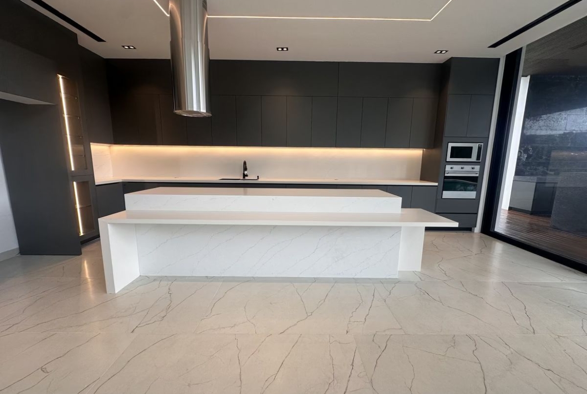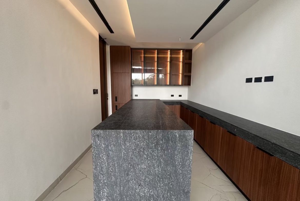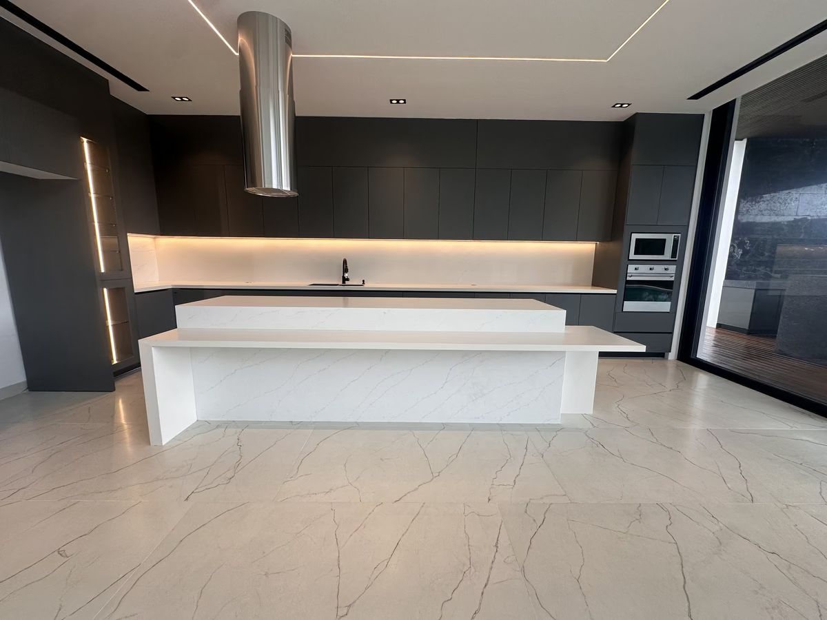 -Cocina integral de diseño equipada con campana, parrilla, tarja y mezcladora, torre de hornos, convección, airfryer y microondas.