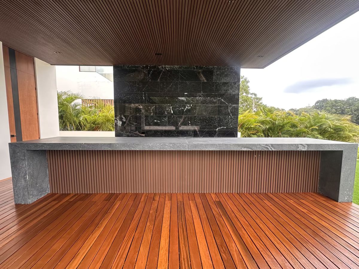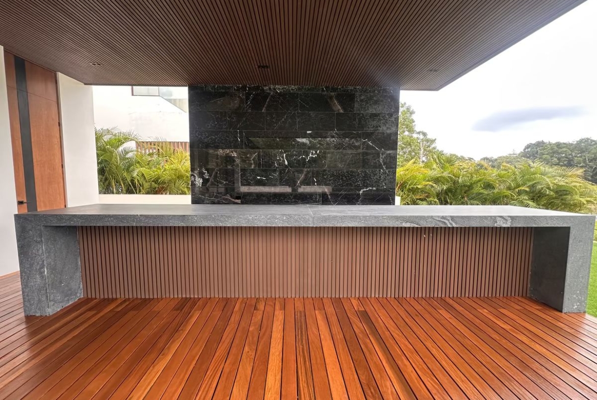 -Acabados de Mármol de importación y madera de Cumarú o similar en muros.